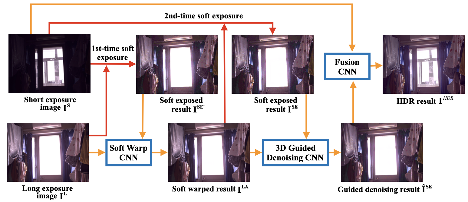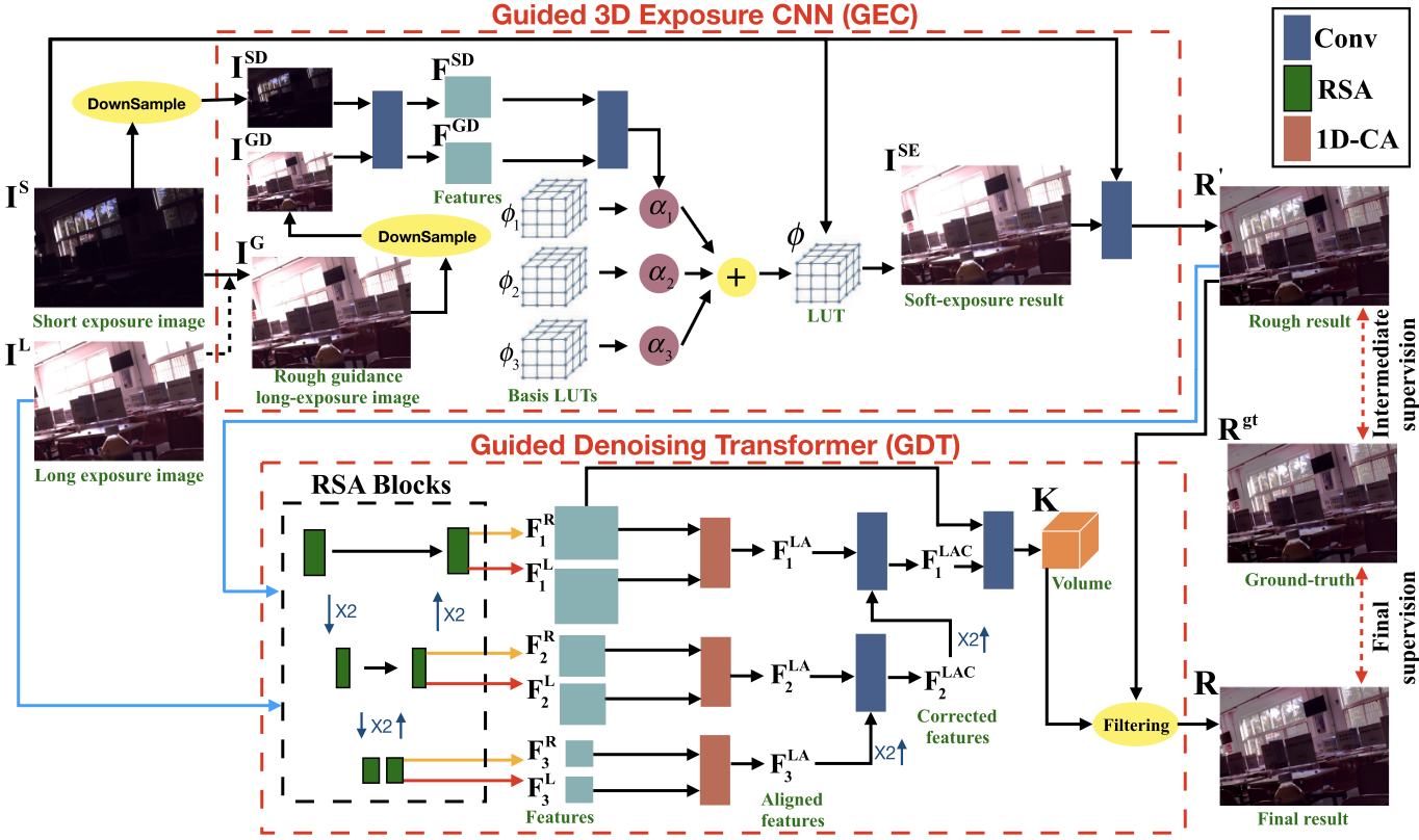 Dual-Lens HDR using Guided 3D Exposure CNN and Guided Denoising Transformer